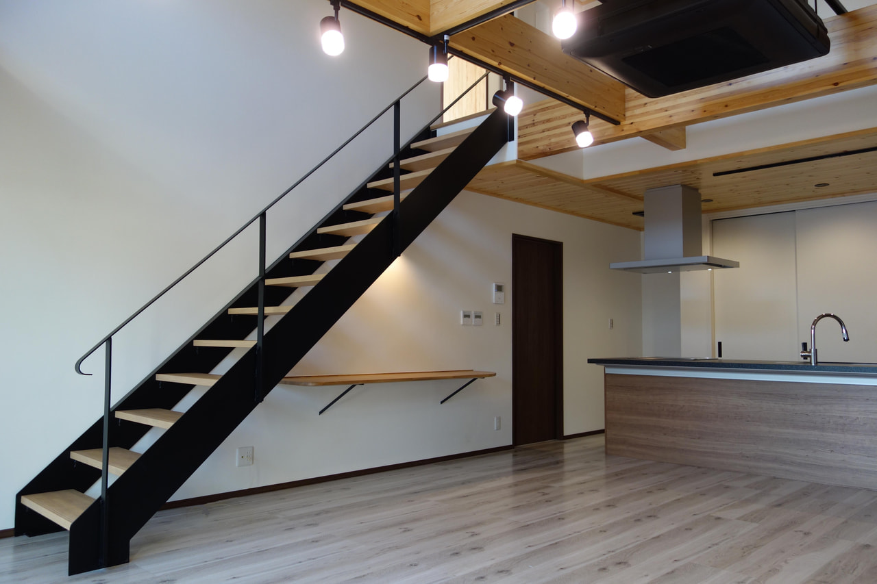 LDKは勾配天井の吹抜けとし空間に広がりをもたせ、