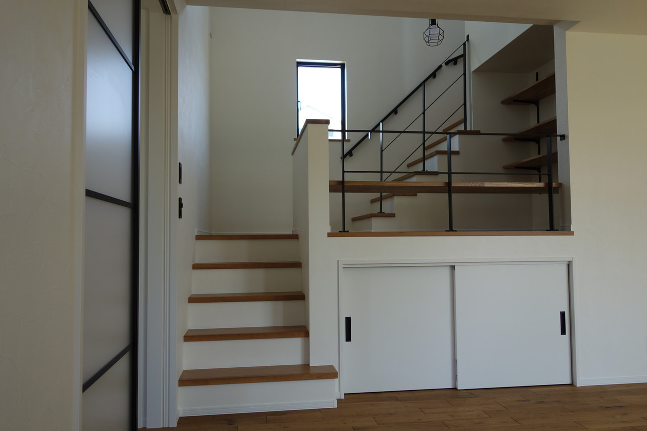 上部の吹抜けは空間の広がりを演出し、下部は収納として有効利用しております。