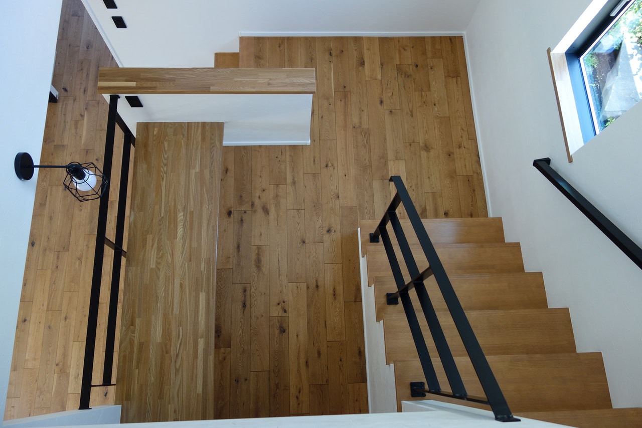 「家族みんなが居心地よく過ごせるスキップフロアのある家づくり」をコンセプトとし、造り付けの机・棚板を備えたコンパクトなスキップフロアスペースをLDKに隣接した階段踊り場の一角に設けました。